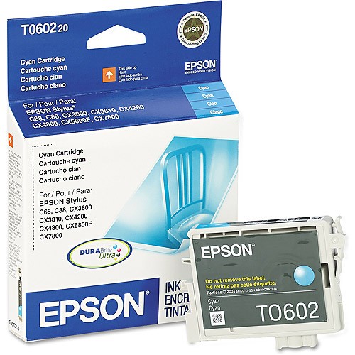 Epson T060220 OEM Cyan Ink Cartridge Compatible Printers / Epson Stylus C68 / Epson Stylus C88 / Epson Stylus C88+ / Epson Stylus C88Plus / Epson Stylus CX3800 / Epson Stylus CX3810 / Epson Stylus CX4200 / Epson Stylus CX4800 / Epson Stylus CX5800 / Epson Stylus CX5800F / Epson Stylus CX7800 / Epson Stylus D68P / Epson Stylus D88 / Epson Stylus D88+ / Epson Stylus D88Plus / Epson Stylus DX3800 / Epson Stylus DX4800